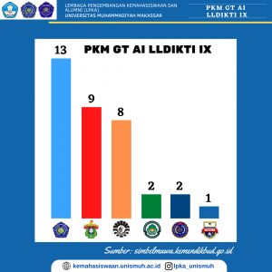 Unismuh meloloskan sebanyak 13 proposal PKM diterima diantaranya 11 proposal untuk PKM artikel ilmiah dan 2 proposal PKM gagasan tertulis. Dengan capaian tersebut, Unismuh Makassar merupakan pemenang hibah terbanyak di Perguruan Tinggi Negeri (PTN) dan Perguruan Tinggi Swasta yang berada dalam naungan Lembaga Layanan Dikti (LLDIKTI) Wilayah IX.