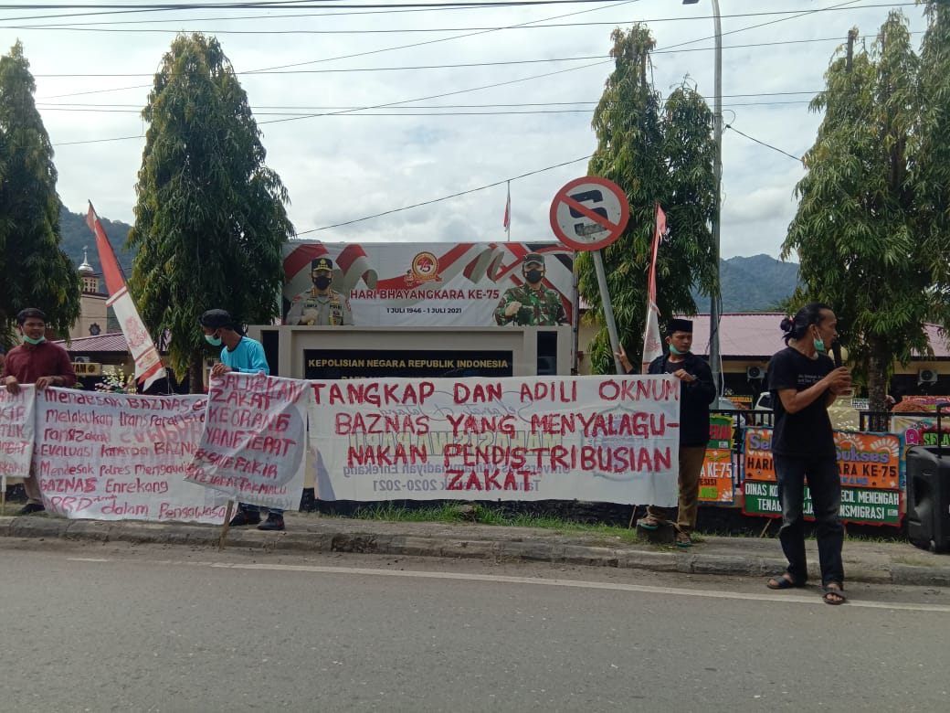 “kami sangat ikut prihatin dengan tindakan baznas Enrekang yang memberikan zakat bantuan kepada beberapa pejabat yang jelas nota benenya golongan kaya sehingga fakir miskin diabaikan, jadi hal seperti inilah yang menjadi virus yang akan mewabah dikabupaten enrekang ketika tidak di atasi” jelas dalam orasinya.