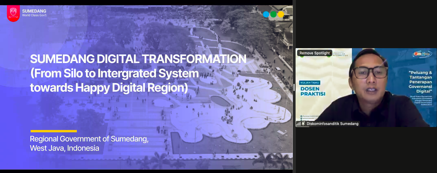 Dalam materinya, Arif Syamsuddin membagikan pengalaman bagaimana proses transformasi Pemerintah Kabupaten Sumedang melakukan transformasi dari sistem adminsitrasi berbasis silo dan eksklusif menjadi sistem integrative dan inklusif dibawah kepemimpinan visioner Bupati Dony Ahmad Munir dan Wakil Bupati Erwan Setiawan. Pemerintah Kabupaten Sumedang berhasil membangun dua superapps yaitu e-Office and Tahu Sumedang.