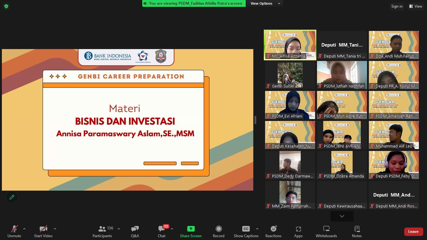 MataKita.co, Makassar – GenBI Wilayah Sulawesi Selatan (Sulsel) menyelenggarakan kegiatan “ GenBI Career Prepation (GENCAR)”pada tanggal 8 Oktober 2023. Kegiatan yang dilaksanakan secara daring dimana kegiatan ini dihadiri oleh seluruh anggota GenBI Wilayah Sulawesi Selatan Periode 2023-2024