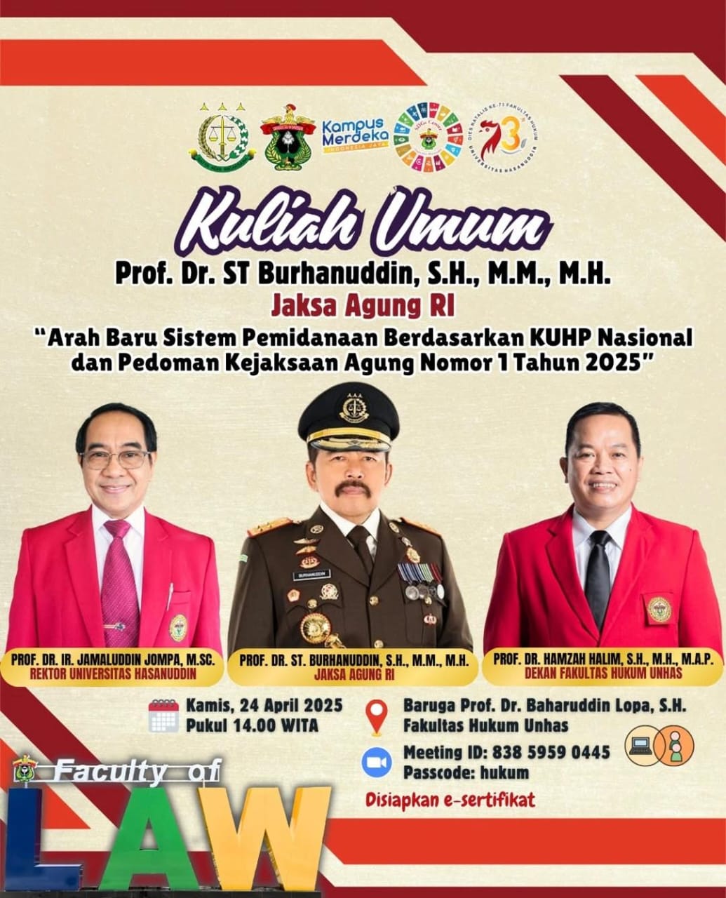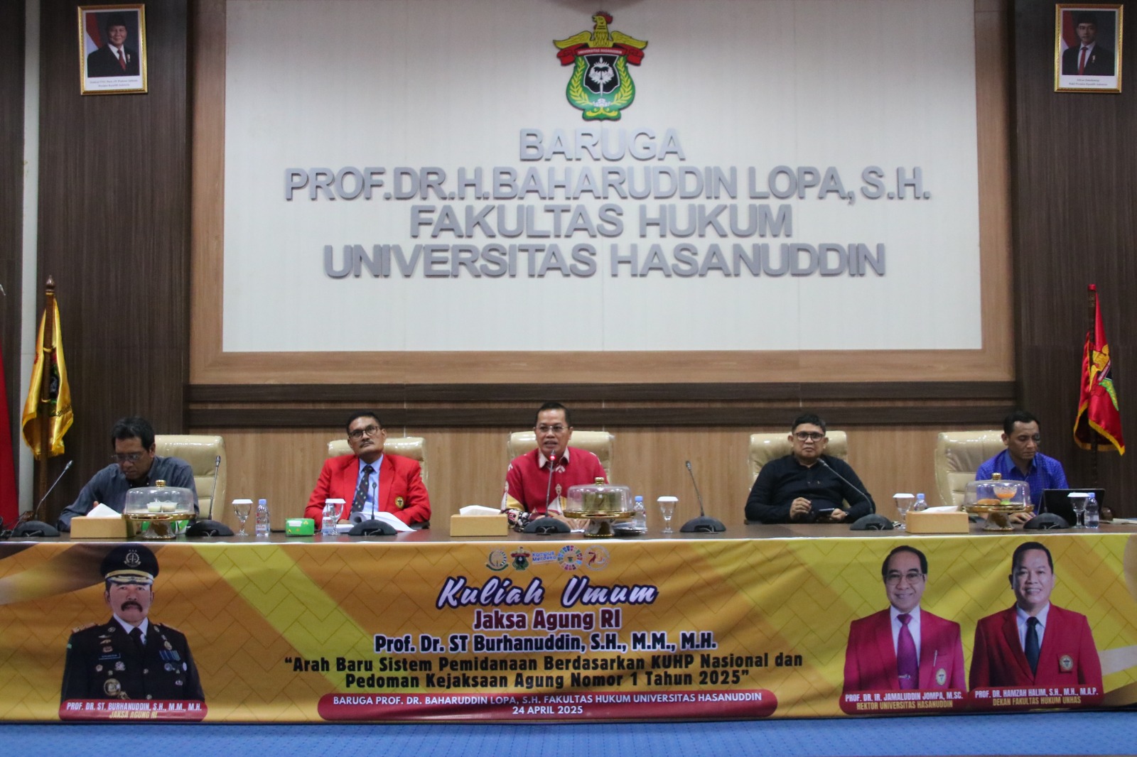 Matakita.co, Makassar, 24 April 2025 – Fakultas Hukum Universitas Hasanuddin (FH UH) kembali menjadi tuan rumah kuliah umum istimewa yang menghadirkan Jaksa Agung Republik Indonesia, Prof. Dr. S.T. Burhanuddin, S.H., M.M., M.H., dengan tema “Arah Baru Sistem Pemidanaan Berdasarkan KUHP Nasional dan Pedoman Kejaksaan Agung Nomor 1 Tahun 2025”. Acara yang digelar secara hybrid di Baruga Baharuddin Lopa dan daring ini dihadiri oleh lebih dari 400 peserta dari kalangan mahasiswa, dosen, hingga aparat penegak hukum, serta 200 orang secara daring.