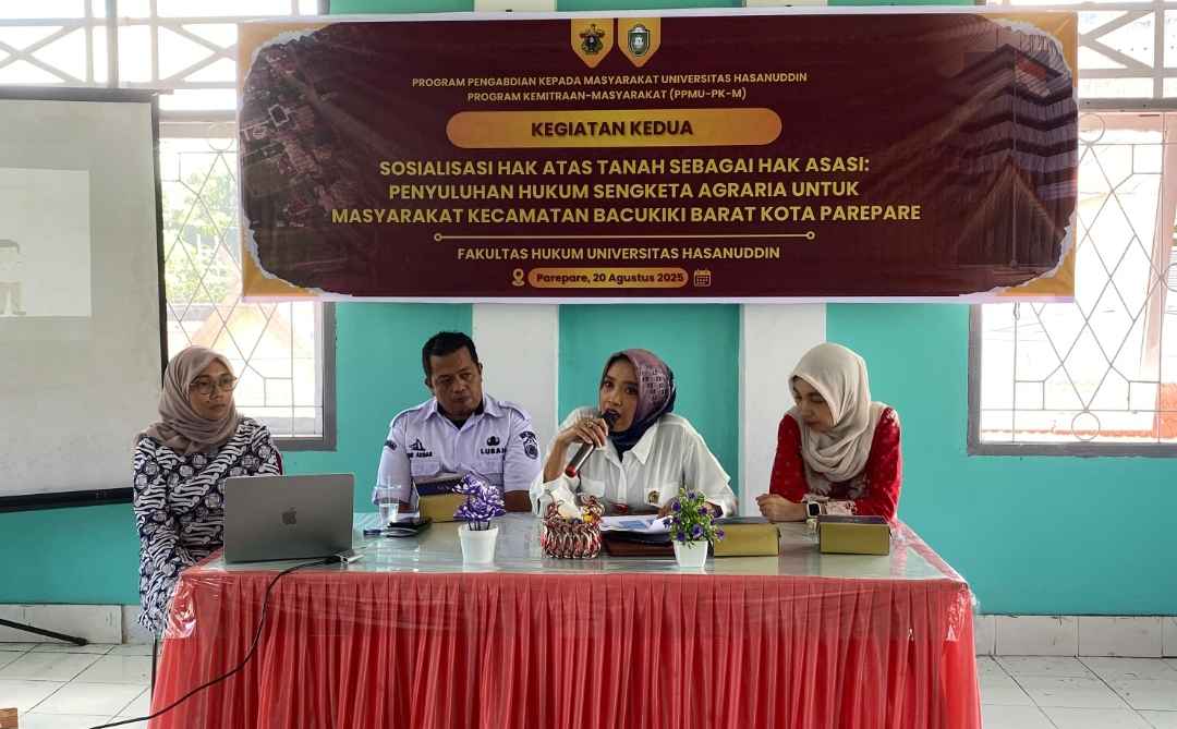 Matakita.co, Parepare- Tim Pengabdian kepada Masyarakat dari Fakultas Hukum Universitas Hasanuddin (Unhas) menggelar sosialisasi hukum bertajuk “Hak Atas Tanah Sebagai Hak Asasi: Penyuluhan Hukum Sengketa Agraria untuk Masyarakat Kecamatan Bacukiki Barat Kota Pare-Pare”. Kegiatan ini dilaksanakan di Kantor Kelurahan Lumpue, Kecamatan Bacukiki Barat, Kota Pare-Pare, pada Rabu, 20 Agustus 2025.