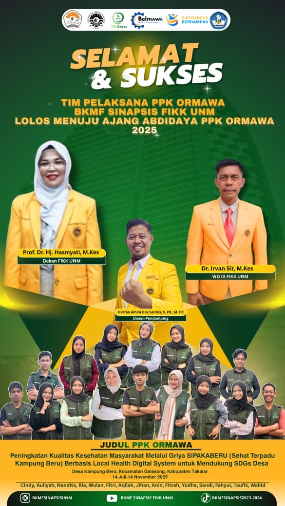 MataKita.co, Makassar – Tim Pelaksana Program Penguatan Kapasitas Organisasi Kemahasiswaan (PPK Ormawa) dari BKMF Sinapsis Fakultas Ilmu Keolahragaan dan Kesehatan Universitas Negeri Makassar (FIKK UNM) resmi dinyatakan lolos menuju Ajang Abdidaya PPK Ormawa 2025 yang akan berlangsung di Malang. (17/11/2025)