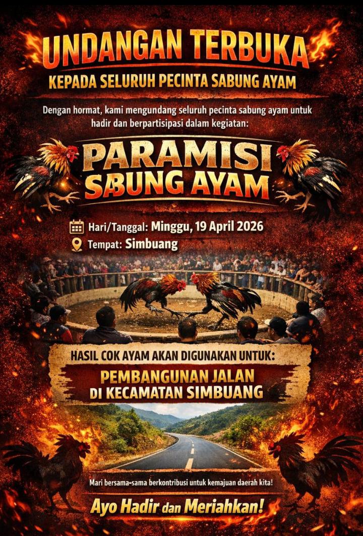 Matakita.co, Tana Toraja — Beredarnya pamflet undangan terbuka bertajuk “Paramisi Sabung Ayam” di media sosial menuai sorotan publik. Kegiatan yang ditujukan kepada para pecinta sabung ayam itu dijadwalkan berlangsung pada Minggu, 19 April 2026, di Kecamatan Simbuang.